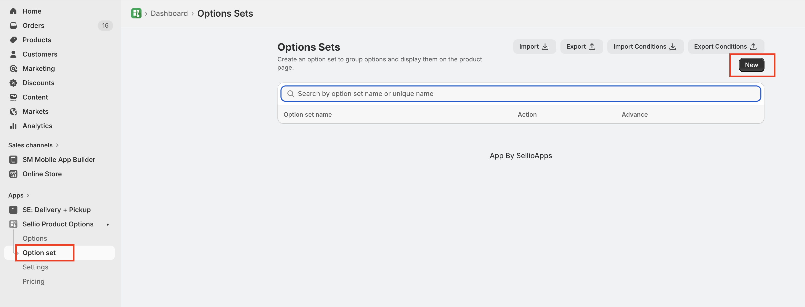 From the app dashboard, go to the Option Sets section and click the Create Option Set button.