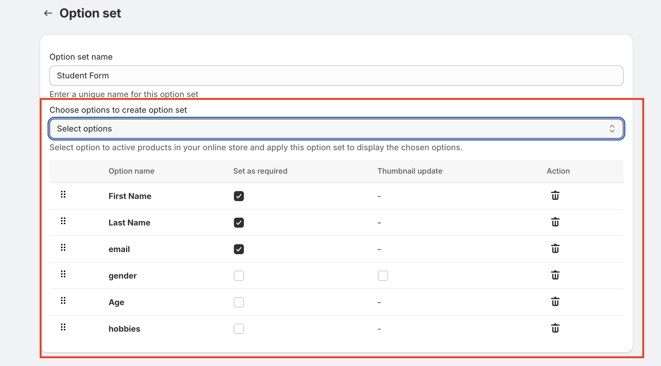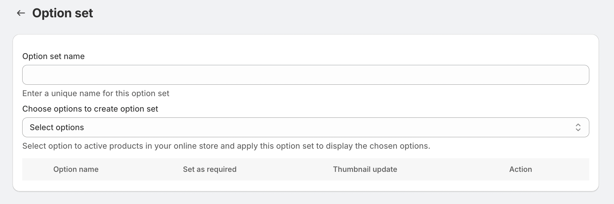 The option set name is used internally to identify the group of options. This name will help merchants easily locate and manage option sets in the app dashboard.