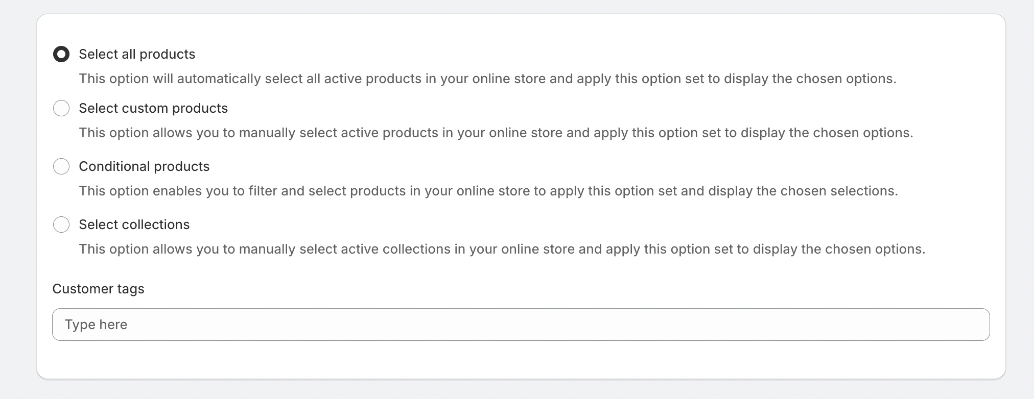 Merchants can select specific products/all products where the option set should appear.