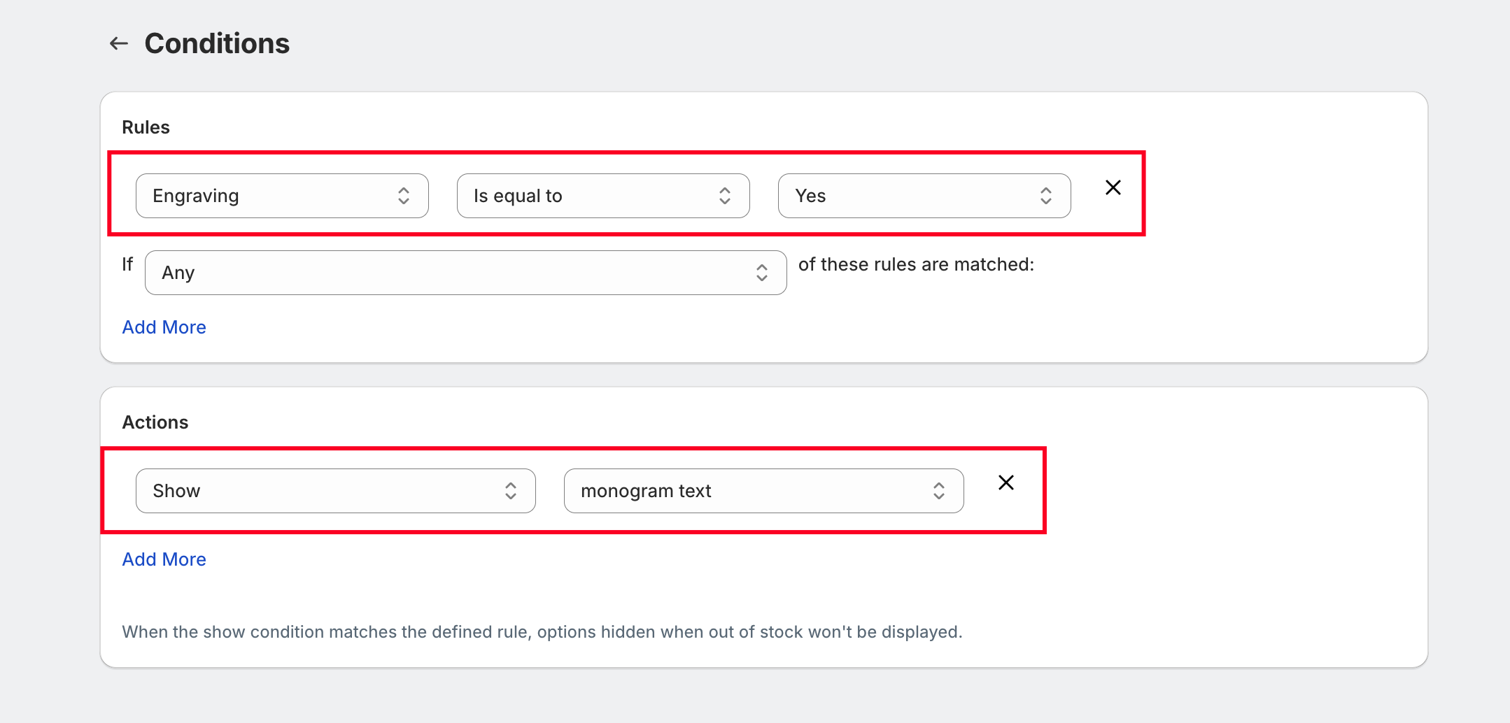 The Conditions feature allows merchants to create dynamic product customization experiences by showing or hiding options based on customer selections.